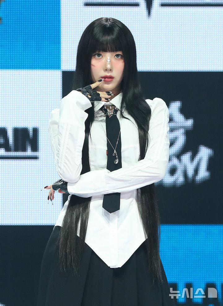[서울=뉴시스] 김혜진 기자 = 그룹 배드빌런 윤서가 19일 오후 서울 광진구 예스24라이브홀에서 열린 새 싱글앨범 '숨(ZOOM)' 발매 기념 쇼케이스에서 포즈를 취하고 있다.