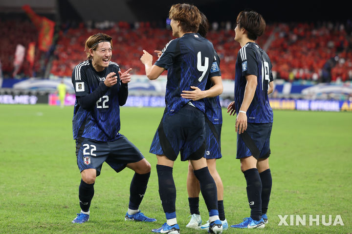 [샤먼=신화/뉴시스] 일본의 이타쿠라 고(왼쪽)가 19일(현지시각) 중국 푸젠성 샤먼의 샤먼 이그렛 스타디움에서 열린 2026 국제축구연맹(FIFA) 북중미 월드컵 아시아 지역 3차 예선 C조 6차전 중국과 경기 전반 추가시간 팀의 두 번째 골을 넣은 후 동료들과 세리머니하고 있다. 일본이 3-1로 승리하고 조 선두를 유지했고 조 5위였던 중국은 최하위인 6위로 내려갔다. 2024.11.20.