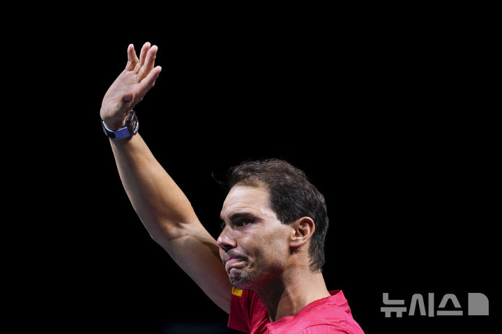 [말라가=AP/뉴시스] 라파엘 나달(154위·스페인)이 20일(현지시각) 스페인 말라가의 마르틴 카르페나 스포츠 홀에서 열린 2024 데이비스컵 파이널스 네덜란드와 8강전 단식 경기에서 패한 후 팬들에게 인사하고 있다. 나달은 현역 마지막 경기에서 보틱 판더잔출프(80위)에게 0-2(4-6 4-6)로 지고 스페인이 네덜란드에 1-2로 패해 탈락하면서 이렇게 현역 생활을 마무리하게 됐다. 2024.11.20.