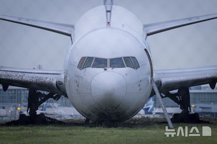 [리치먼드=AP/뉴시스] 19일(현지시각) 캐나다 브리티시컬럼비아주 리치먼드의 밴쿠버 국제공항에서 아마존 프라임 에어 보잉 767-338 화물기가 활주로를 벗어나 풀밭에 멈춰 서 있다. 현지 당국은 이 항공기가 착륙 중 '비행 제어'에 문제가 생겨 이 같은 사고가 발생했으며 승무원 3명은 무사하다고 전했다. 2024.11.20.