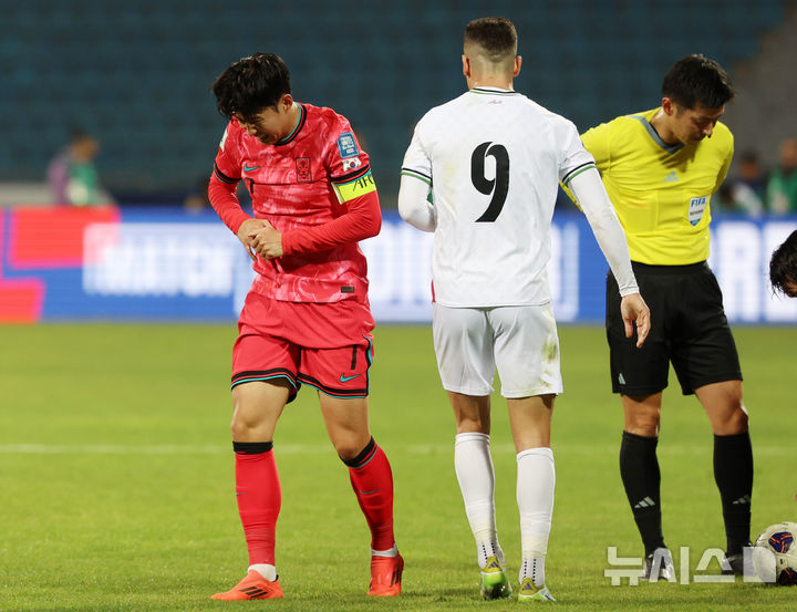 [암만(요르단)=뉴시스] 이영환 기자 = 19일 오후(현지시각) 요르단 암만 국제 경기장에서 열린 2026 국제축구연맹(FIFA) 북중미 월드컵 아시아 3차 예선 B조 6차전 한국과 팔레스타인의 경기 전반전, 한국 손흥민이 팔레스타인 타메르 세얌과 충돌한 후 굳은 표정을 짓고 있다. 2024.11.20. [email protected]