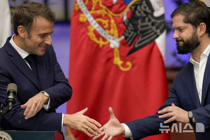 [산티아고=AP/뉴시스] 에마뉘엘 마크롱(왼쪽) 프랑스 대통령이 20일(현지시각) 칠레 산티아고의 라 모네다 대통령궁에서 가브리엘 보리치 대통령과 악수하고 있다. 칠레를 국빈 방문한 마크롱 대통령은 보리치 대통령과 리튬, 인공지능(AI) 분야 교류 강화에 의지를 보인 것으로 알려졌다. 2024.11.21.