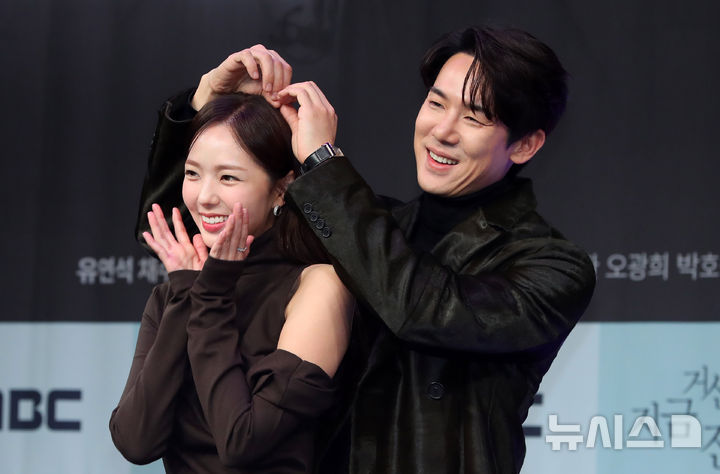 [서울=뉴시스] 김혜진 기자 = 배우 채수빈(왼쪽), 유연석이 21일 오후 서울 마포구 MBC에서 열린 MBC 새 금토드라마 '지금 거신 전화는' 제작발표회에서 포즈를 취하고 있다.