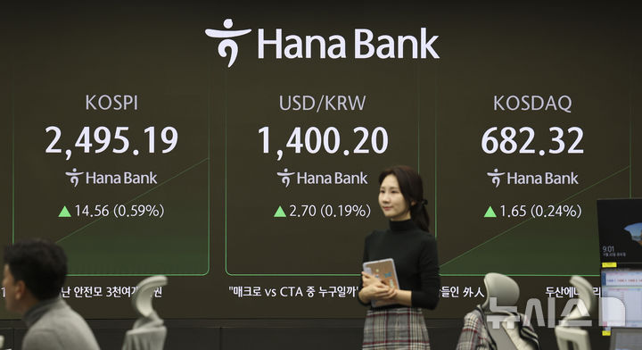 [서울=뉴시스] 김근수 기자 = 코스피가 전 거래일(2480.63)보다 12.79포인트(0.52%) 오른 2493.42에 개장한 22일 서울 중구 하나은행 본점 딜링룸 전광판에 지수가 표시되고 있다.