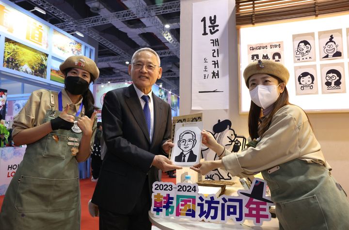 [서울=뉴시스] 전신 기자 = 유인촌 문화체육관광부 장관이 지난 22일 중국 상하이 국가컨벤션 센터에서 열린 중국 국제여유교역회 한국관에서 캐리커쳐 체험을 한 뒤 기념촬영하고 있다. (사진=문화체육관광부 제공) 2024.11.23. [email protected] *재판매 및 DB 금지