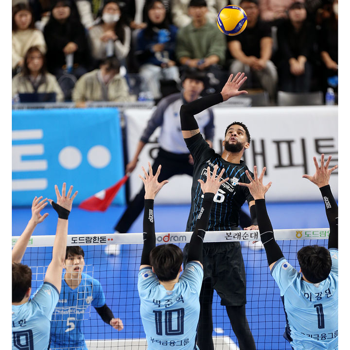 [서울=뉴시스] 전신 기자 = 23일 충남 천안시 유관순체육관에서 열린 도드람 프로배구 2024-2025 V리그 남자부 현대캐피탈과 우리카드의 경기에서 현대캐피탈 레오가 공격을 시도하고 있다. (사진=현대캐피탈 배구단 제공) 2024.11.23. [email protected] *재판매 및 DB 금지