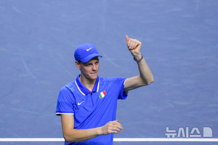 [말라가=AP/뉴시스] 이탈리아의 얀니크 신네르(1위)가 23일(현지시각) 스페인 말라가의 마르틴 카르페나 스포츠홀에서 열린 2024 데이비스컵 파이널스 호주와 준결승 2단식에서 알렉스 드미노(9위)를 꺾은 후 세리머니하고 있다. 이탈리아는 신네르가 2-0(6-3 6-4)으로 이기고 앞선 1단식도 승리하면서 호주를 2-0으로 꺾고 결승에 올라 네덜란드와 우승을 다투게 됐다. 2024.11.24.