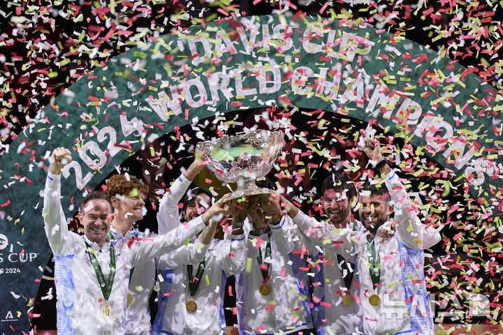 [말라가=AP/뉴시스] 이탈리아 선수들이 24일(현지시각) 스페인 말라가의 마르틴 카르페나 스포츠홀에서 열린 2024 데이비스컵 파이널스 정상에 올라 데이비스컵을 들고 환호하고 있다. 이탈리아는 결승 1, 2단식에서 마테오 베레티니(35위)와 얀니크 신네르(1위)가 각각 승리해 네덜란드를 2-0으로 꺾고 2연패하며 통산 3번째 우승을 차지했다. 2024.11.25.