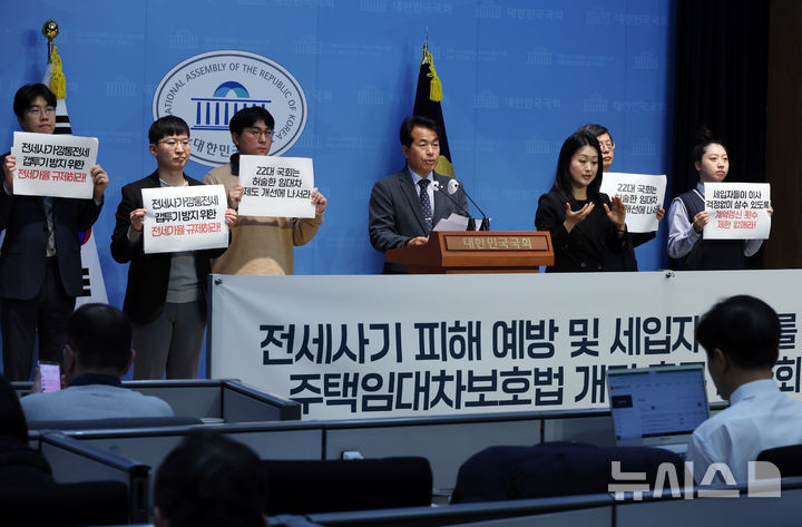 [서울=뉴시스] 고승민 기자 = 윤종오 진보당 원내대표와 주거권네트워크 등 시민단체 회원들이 25일 서울 여의도 국회 소통관에서 전세사기 피해 예방 및 세입자 보호를 위한 주택임대차보호법 개정 촉구 기자회견을 하고 있다. 2024.11.25. [email protected]