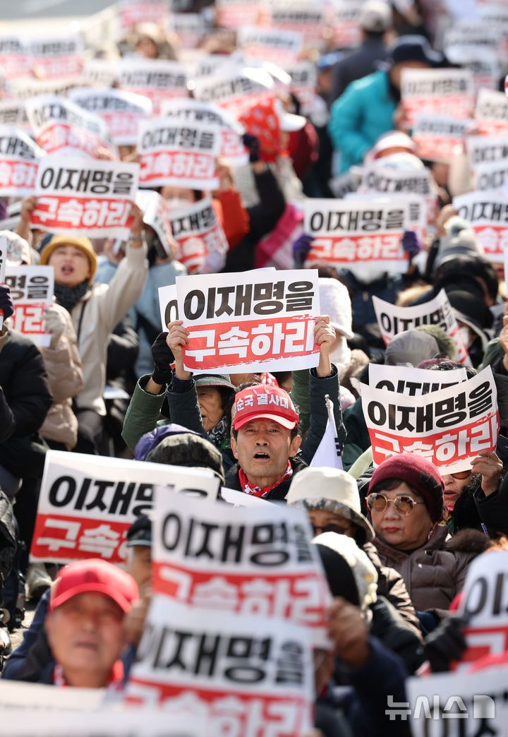 [서울=뉴시스] 김진아 기자 = 이재명 더불어민주당 대표의 위증교사 혐의 1심 선고 공판이 열리는 25일 서울 서초구 서울중앙지방법원 인근에서 자유통일당 등이 이 대표 법정 구속을 촉구하는 집회가 열리고 있다. 2024.11.25. [email protected]