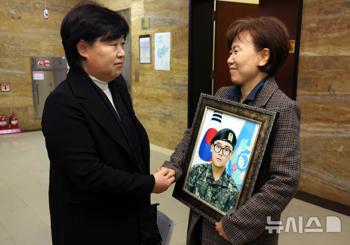 [서울=뉴시스] 고승민 기자 = 故 홍정기 일병 어머니 박미숙 씨가 26일 서울 여의도 국회에서 열린 제418회 국회(정기회) 법제사법위원회 제5차 법안심사제1소위원회를 찾아 서영교 위원 더불어민주당 위원과 대화를 하고 있다. 2024.11.26. [email protected]