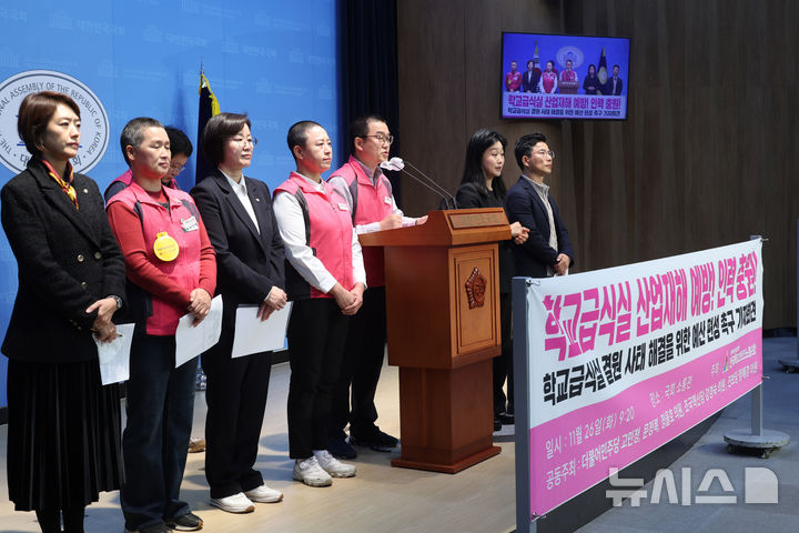 [서울=뉴시스] 조성봉 기자 = 민태호 민주노총 서비스연맹 전국학교비정규직노동조합 위원장이 26일 오전 서울 여의도 국회 소통관에서 열린 '학교급식실 결원 사태 해결을 위한 예산 편성 촉구 기자회견'에서 발언을 하고 있다. 2024.11.26. [email protected]