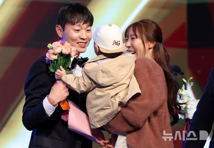 [서울=뉴시스] 추상철 기자 = 26일 오후 서울 송파구 롯데호텔 월드에서 열린 '2024 신한 SOL뱅크 KBO 시상식'에서 수비상 외야수부문 수상자로 선정된 두산 중견수 정수빈이 가족으로 부터 꽃다발을 받고 있다. 2024.11.26. [email protected]