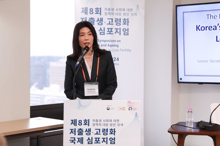 [서울=뉴시스] 유혜미 대통령실 저출생대응수석이 27일 서울 종로구 서울 한중일 3국 협력사무국(TCS) 컨퍼런스홀에서 열린 제8회 저출생·고령화 국제 심포지엄에 참석해 발언하고 있다. (사진=통계청 제공) 2024.11.27. [email protected] *재판매 및 DB 금지