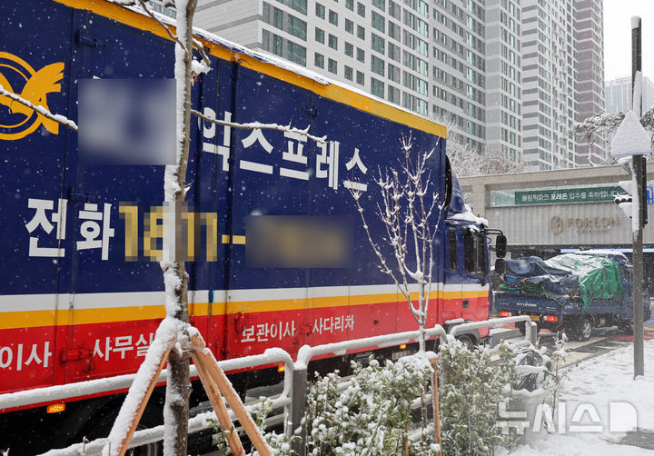 [서울=뉴시스] 이영환 기자 = 27일 오전 서울 강동구 올림픽파크 포레온으로 이사짐센터 차량이 들어가고 있다.