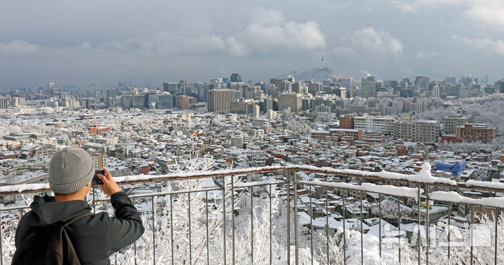 [서울=뉴시스] 김금보 기자 = 서울에 역대 11월 중 가장 많은 적설량이 기록된 27일 오후 서울 종로구 인왕산을 찾은 시민이 설경을 만끽하고 있다. 2024.11.27. [email protected]