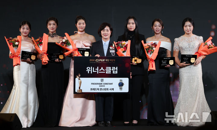 [서울=뉴시스] 홍효식 기자 = 27일 서울 강남구 그랜드 인터컨티넨탈 서울 파르나스에서 열린 2024 KLPGA 대상 시상식에서 위너스클럽을 수상한 노승희(왼쪽부터), 김민별, 김재희, 문정민, 배소현, 유현조 선수가 기념촬영하고 있다. 2024.11.27. [email protected]