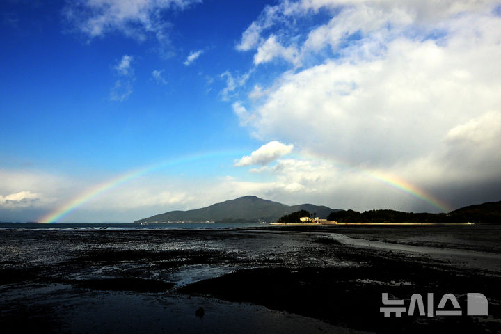 [남해=뉴시스] 차용현 기자 = 겨울비가 내린 28일 오후 경남 남해군 이동면 인근 한 바닷가에 오색빛깔 무지개 떠올라 눈길을 끌고 있다. 2024.11.28. [email protected]