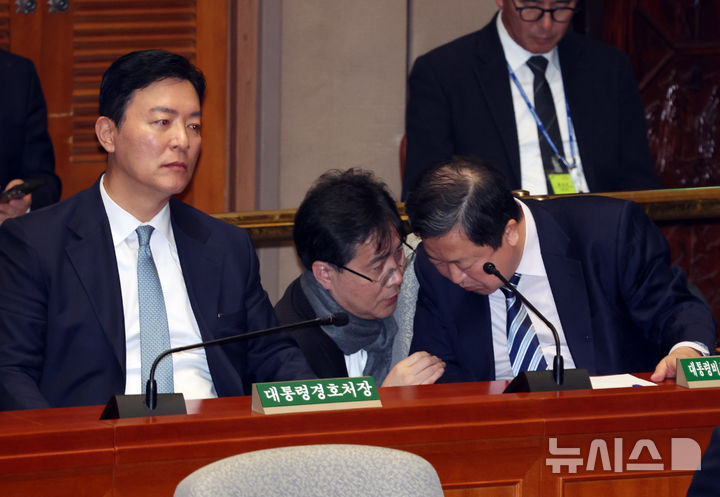 [서울=뉴시스] 고승민 기자 = 박춘섭 대통령실 경제수석이 29일 서울 여의도 국회에서 열린 제418회 국회(정기회) 제13차 예산결산특별위원회에서 관계자와 대화하고 있다. 2024.11.29. [email protected]