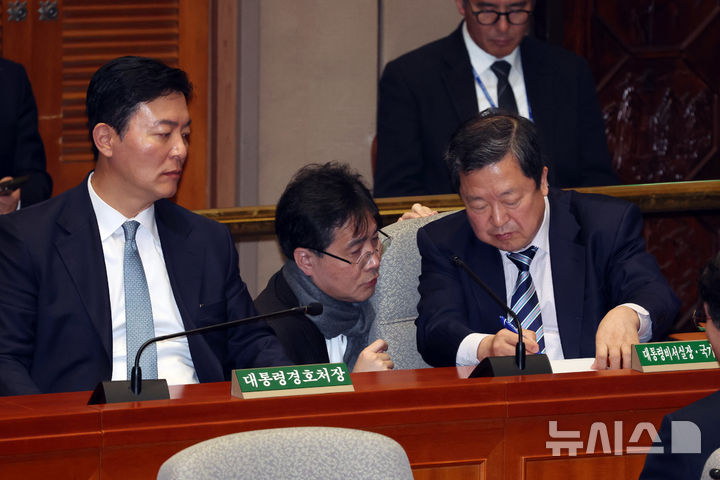 [서울=뉴시스] 고승민 기자 = 박춘섭 대통령실 경제수석이 29일 서울 여의도 국회에서 열린 제418회 국회(정기회) 제13차 예산결산특별위원회에서 관계자와 대화하고 있다. 2024.11.29. [email protected]