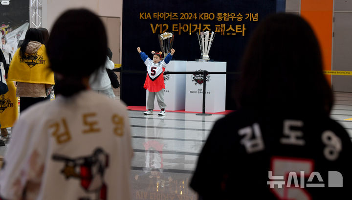 [광주=뉴시스] 변재훈 기자 = 프로야구 KIA타이거즈 팬들이 30일 오후 광주 서구 김대중컨벤션센터에서 열리는 'KIA 타이거즈 V12 팬 페스트' 행사에 앞서 올 시즌 정규시즌·한국시리즈 우승 트로피 앞에서 기념 촬영을 하고 있다. 타이거즈의 올 시즌 통합우승을 축하하기 위한 이날 행사에는 KIA타이거즈 선수단과 코칭스태프, 팬 6000여 명이 참석한다. 2024.11.30. [email protected]
