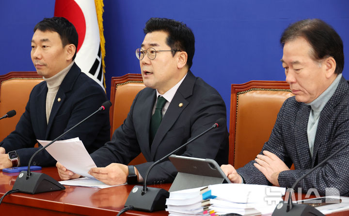 [서울=뉴시스] 조성우 기자 = 박찬대(가운데) 더불어민주당 원내대표가 1일 오전 서울 여의도 국회에서 열린 2025년 예산안 및 순직해병국정조사 계획 기자간담회에서 발언하고 있다. 왼쪽부터 김용민 원내정책수석부대표, 박찬대 원내대표, 정태호 기획재정위원회 간사. 2024.12.01. [email protected]