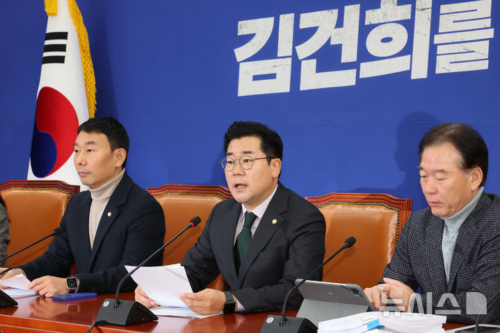 [서울=뉴시스] 조성우 기자 = 박찬대(가운데) 더불어민주당 원내대표가 1일 오전 서울 여의도 국회에서 열린 2025년 예산안 및 순직해병국정조사 계획 기자간담회에서 발언하고 있다. 왼쪽부터 김용민 원내정책수석부대표, 박찬대 원내대표, 정태호 기획재정위원회 간사. 2024.12.01. [email protected]