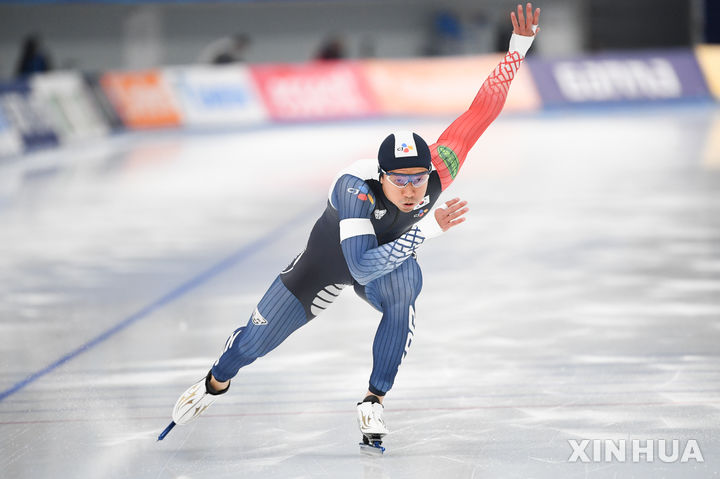 [베이징=신화/뉴시스] 김준호가 1일(현지시각) 중국 베이징의 국립빙상장에서 열린 2024-25 국제빙상경기연맹(ISU) 스피드스케이팅 월드컵 2차 남자 500m 2차 레이스에서 역주하고 있다. 김준호는 34초67을 기록하며 동메달을 따내 시즌 첫 메달을 수확했다. 2024.12.02.