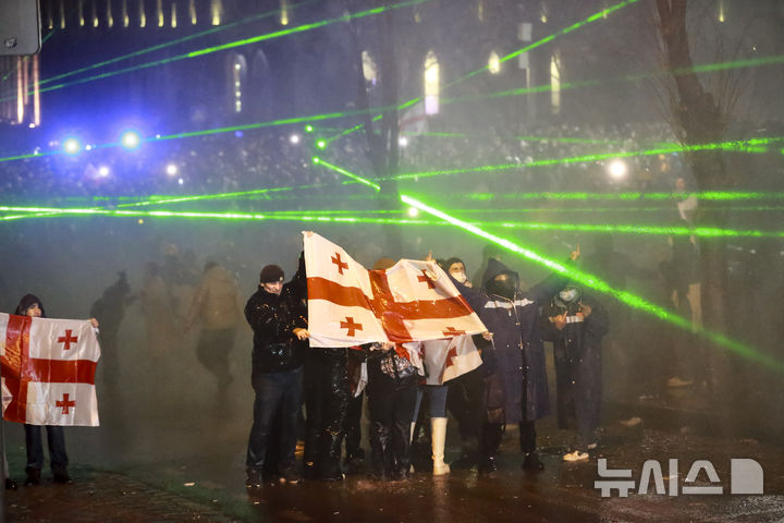 [트빌리시=AP/뉴시스] 1일(현지시각) 조지아 트빌리시의 의회 건물 밖에서 국기를 든 시위대가 경찰의 물대포에 맞서고 있다. 시위대는 친러 여당 '조지아의 꿈' 소속인 이라클리 코바히제 총리가 2028년까지 유럽연합(EU) 가입 협상을 중단한다는 결정에 항의하며 대규모 시위를 이어가고 있다. 2024.12.02.
