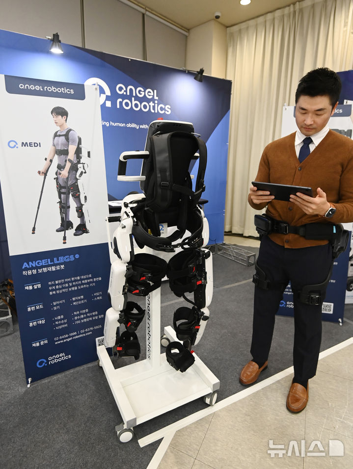 [수원=뉴시스] 김종택 기자 = 2일 경기도 수원시 장안구 보훈교육 연구원에서 열린 '2024 보훈복지 재활·간병·서비스 로봇 박람회에서 관계자가 착용형 보행재활 로봇을 시연하고 있다.