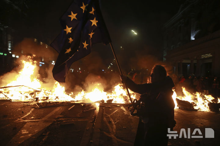 [트빌리시=AP/뉴시스] 3일(현지시각) 조지아 트빌리시에서 정부의 유럽연합(EU) 가입 협상 중단 결정에 항의하는 시위가 이어진 가운데 한 시위자가 유럽연합(EU) 국기를 들고 불타는 바리케이드 옆에 서 있다. 2024.12.03.
