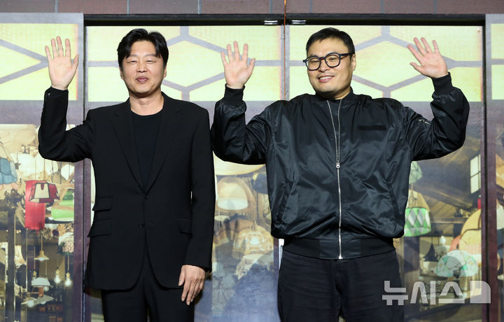 [서울=뉴시스] 김혜진 기자 = 김희원(왼쪽) 감독, 강풀 작가가 3일 오전 서울 강남구 코엑스에서 열린 디즈니 플러스 '조명가게' 제작발표회에서 포즈를 취하고 있다.