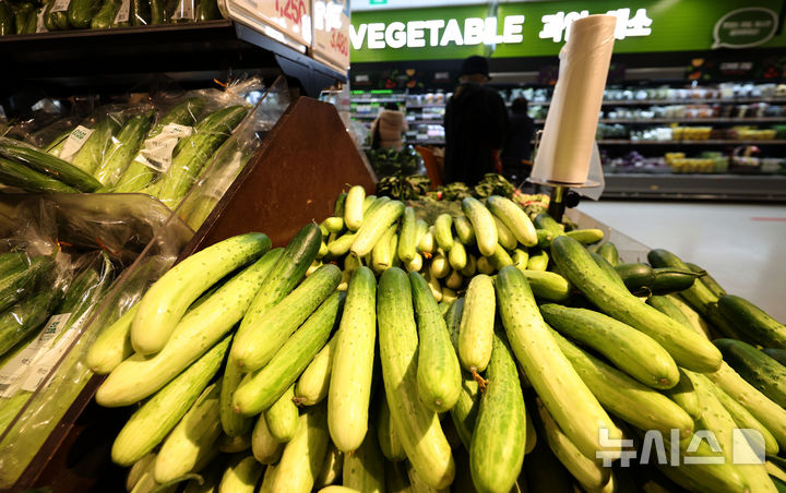 통계청 11월 소비자물가 동향에 따르면 지난달 소비자물가지수는 114.40(2020=100)로 1년 전보다 1.5% 올랐다. 농축수산물은 전년보다 1.0% 올랐고 채소가 10.4%로 크게 뛰었다. 특히 김장철 대표 채소류인 무가 1년 전보다 62.5% 오르며 채소류 물가를 끌어올렸다. 호박은 42.9%, 오이는 27.6%, 토마토가 15.3% 상승했다. 3일 서울 소재 유통매장에서 오이가 판매되고 있다. 2024.12.03. [email protected]
