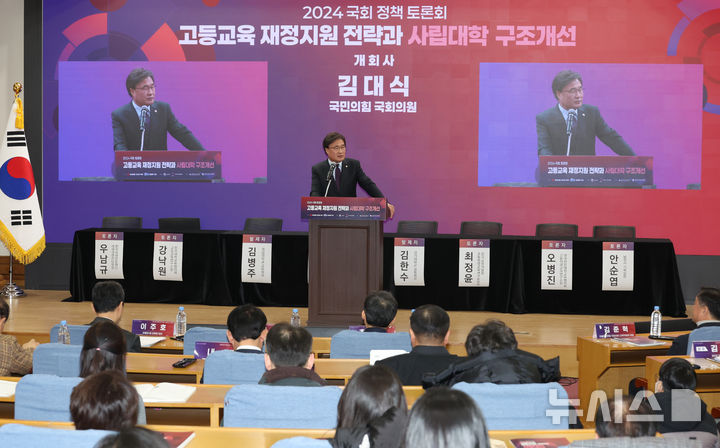 [서울=뉴시스] 고승민 기자 = 김대식 국민의힘 의원이 3일 서울 여의도 국회 의원회관에서 열린 고등교육 재정지원 전략과 사립대학 구조개선 토론회에서 개회사를 하고 있다. 2024.12.03. [email protected]