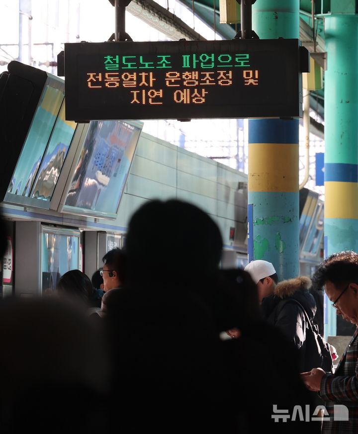 [인천=뉴시스] 전진환 기자 = 전국철도노동조합 총파업일인 5일 오전 인천 부평역 승강장 전광판에   열차 지연을 알리는 안내가 나오고 있다. 2024.12.05. [email protected]