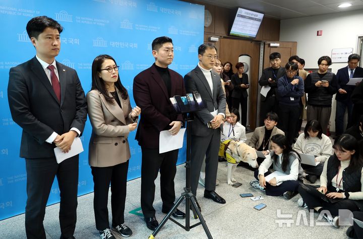 [서울=뉴시스] 조성봉 기자 = 김재섭 국민의힘 의원을 비롯한 소장파 의원들이 5일 오후 서울 여의도 국회 소통관에서 '윤석열 대통령 임기단축 개헌 제안' 기자회견을 마치고 취재진의 질문에 답변하고 있다. 왼쪽부터 우재준, 김소희, 김 의원, 김상욱, 김예지 의원. 2024.12.05. [email protected]