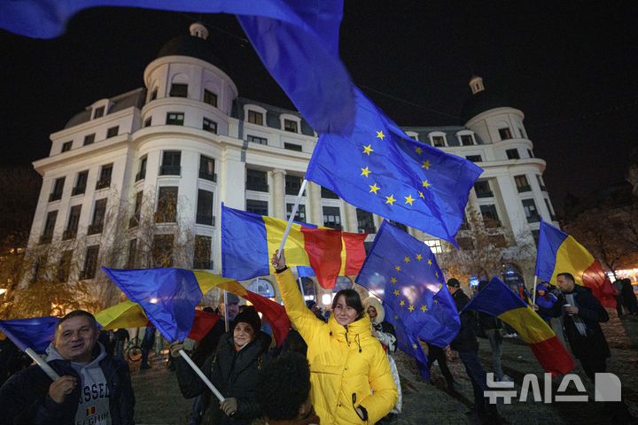 [부쿠레슈티=AP/뉴시스] 루마니아 대선 결선 투표를 3일 앞둔 5일(현지시각) 부쿠레슈티에서 친유럽연합(EU) 시위대가 루마니아 국기와 EU 깃발을 흔들며 시위하고 있다. 시위대는 친러 성향의 컬린 조르제스쿠 후보가 대통령이 되면 루마니아의 안전과 유럽적 가치를 위협할 수 있다고 우려하고 있다. 한편, 지난 1차 투표에서 승리한 무소속의 제오르제스쿠 후보는 대통령 당선 시 우크라이나에 대한 지원을 전면 중단하겠다고 밝혔다. 2024.12.06.
