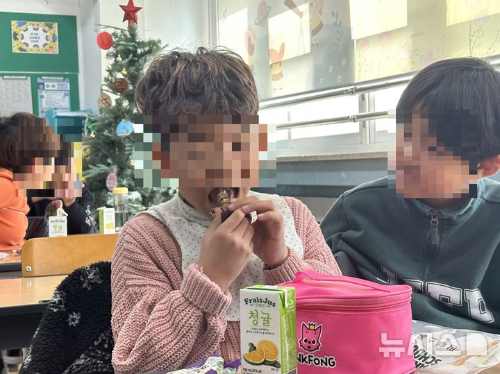 [대전=뉴시스] 김도현 기자 = 6일 오전 전국학교비정규직연대회의가 총파업에 돌입한 가운데 대전 동구 한 초등학교에서 학생이 제공된 대체식을 먹고 있다. 2024.12.06. [email protected]