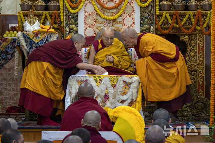 [다람살라=AP/뉴시스] 티베트 영적 지도자 달라이 라마(가운데)가 6일(현지시각) 인도 다람살라에서 자신의 장수를 기원하는 인도 신도들의 기도회를 주재하며 승려들과 대화하고 있다. 2024.12.06.