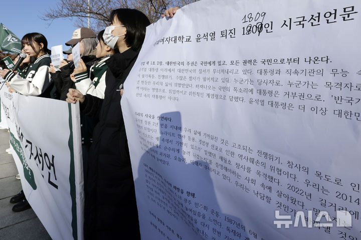 [서울=뉴시스] 최동준 기자 = 이화여자대학교 1809인 대학생이 6일 서울 서대문구 이화여자대학교에서 '윤석열 정권 퇴진 촉구' 시국선언을 하고 있다. 2024.12.06. [email protected]
