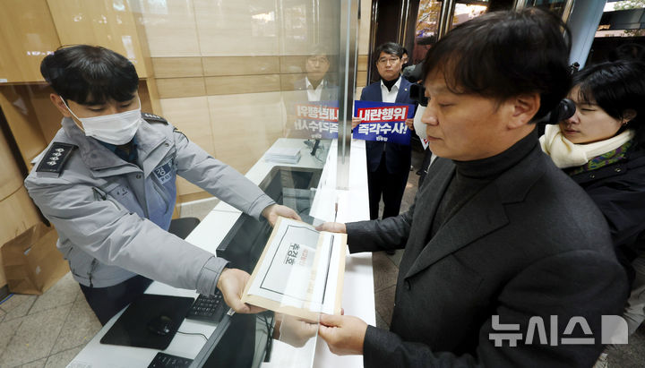 [서울=뉴시스] 추상철 기자 = 이태형 더불어민주당 법률위원장이 6일 오후 서울 서대문구 경찰청에서 '추경호 국민의힘 원내대표의 내란죄(부화수행) 혐의' 고발장을 접수하고 있다. 2024.12.06. [email protected]