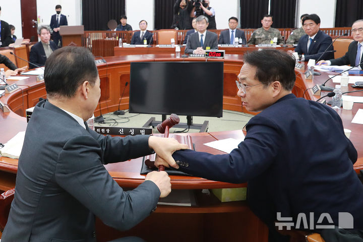 [서울=뉴시스] 국회사진기자단 = 신성범 위원장(왼쪽)이 7일 오전 서울 여의도 국회에서 열린 정보위원회 전체회의에서 정회를 선언하려 하자 박선원 야당 간사가 의사봉을 잡으며 막아서고 있다. 이날 민주당은 정보위 비상계엄 관련 긴급 현안질의에 대한 공개 회의를 제안했다. 2024.12.07. [email protected]