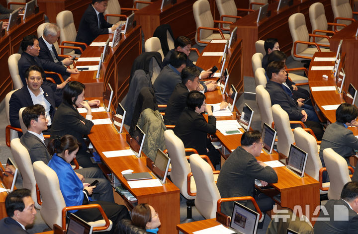 [서울=뉴시스] 고승민 기자 = 더불어민주당 등 야당 의원들이 7일 서울 여의도 국회에서 김건희 여사 특검 및 윤석열 대통령 탄핵소추안을 안건으로 열린 제418회 국회(정기회) 제17차 본회의에서 대통령 탄핵소추안 투표 시간 동안 국민의힘 의원들을 기다리고 있다. 2024.12.07. [email protected]