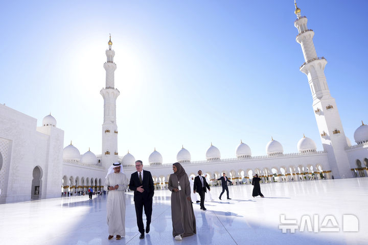 [아부다비=AP/뉴시스] 키어 스타머(가운데) 영국 총리가 9일(현지시각) 아랍에미리트(UAE) 아부다비의 셰이크 자이드 그랜드 모스크를 방문해 이 사원의 유시프 알로바이들리(왼쪽) 사무총장의 설명을 듣고 있다. 스타머 총리는 3일간의 공식 일정으로 아랍에미리트, 사우디아라비아, 키프로스 등을 방문 중이다. 2024.12.09.