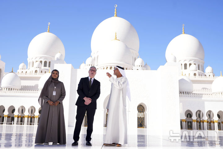 [아부다비=AP/뉴시스] 키어 스타머(가운데) 영국 총리가 9일(현지시각) 아랍에미리트(UAE) 아부다비의 셰이크 자이드 그랜드 모스크를 방문해 이 사원의 유시프 알로바이들리(오른쪽) 사무총장의 설명을 듣고 있다. 스타머 총리는 3일간의 공식 일정으로 아랍에미리트, 사우디아라비아, 키프로스 등을 방문 중이다. 2024.12.09.