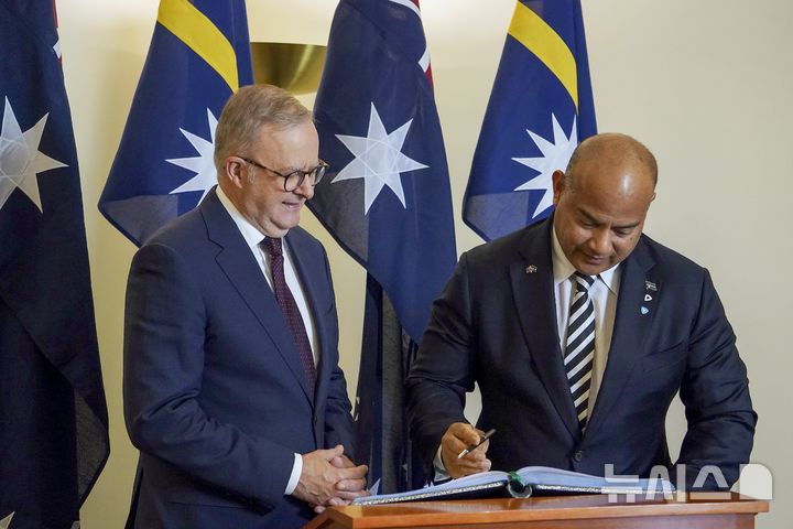 [캔버라(호주)=AP/뉴시스]앤서니 앨버니즈 호주 총리(왼쪽)가 9일 호주 캔버라에서 호주 의회를 방문한 데이비드 아데앙 나우루 대통령이 방명록에 서명하는 것을 지켜보고 있다. 나우루는 9일 호주와 5년 간 1억4000만 호주달러(약 1290원) 규모의 경제협력 협정 체결을 발표하면서 나우루가 중국을 포함한 제3국과 체결할 수도 있는 다양한 협정에 대해 호주에 거부권을 부여했다. 2024.12.09.