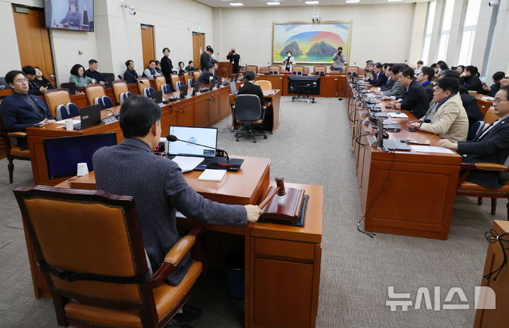 [서울=뉴시스] 조성우 기자 = 9일 오전 서울 여의도 국회에서 열린 정무위원회 전체회의에서 윤한홍 위원장이 산회를 선포하며 의사봉을 두드리고 있다. 2024.12.09. [email protected]