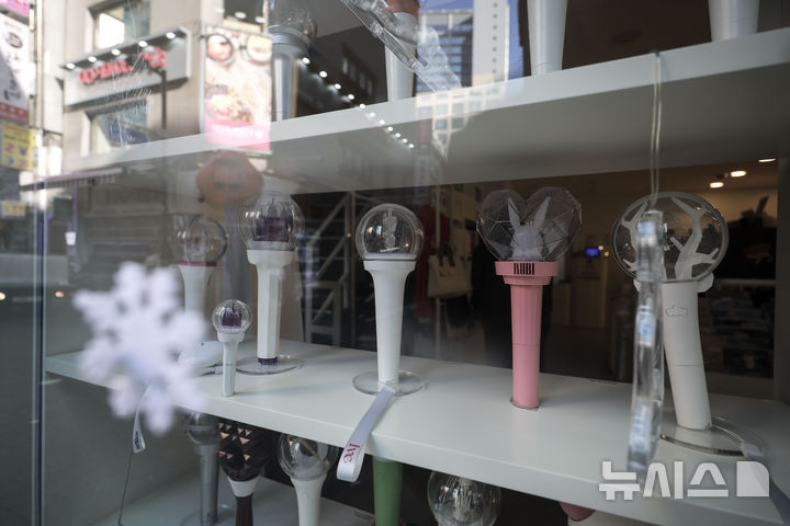 [서울=뉴시스] 정병혁 기자 = 9일 서울시내 K팝 용품 판매점에 아이돌 그룹 응원봉이 진열되어 있다. K팝 문화를 대표하는 아이돌 그룹 응원봉이 대통령 탄핵 집회에 활용되며 관심이 높아지고 있다. 지난 주말 진행된 윤석열 대통령 퇴진 촉구 등 관련 대규모 집회 이후 온라인상에서 응원봉 수요가 급증했다. 11번가와 네이버쇼핑에서는 실시간 쇼핑 검색어 1위에 응원봉이 오르기도 했다. 2024.12.09. [email protected]
