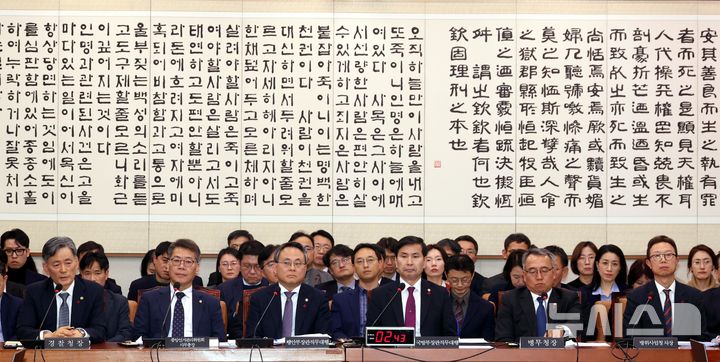 [서울=뉴시스] 조성봉 기자 = 조지호(왼쪽) 경찰청장이 9일 오후 서울 여의도 국회에서 열린 법제사법위원회 전체회의에서 의원들의 질의에 답변하고 있다. 왼쪽부터 조 경찰청장, 김용빈 중앙선거관리위원회 사무총장, 고기동 행안부 직무대행,김선호 국방부 장관 직무대행, 김종철 병무청장, 강환석 방위사업청차장. 2024.12.09. [email protected]