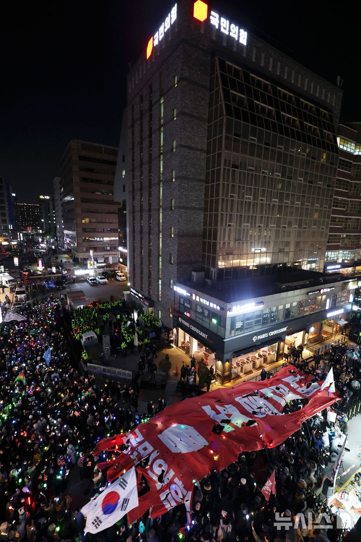 [서울=뉴시스] 홍효식 기자 = 9일 서울 여의도 국민의힘 당사 앞에서 시민들이 윤석열 대통령 탄핵과 국민의힘 해체를 촉구하고 있다. 2024.12.09. [email protected]